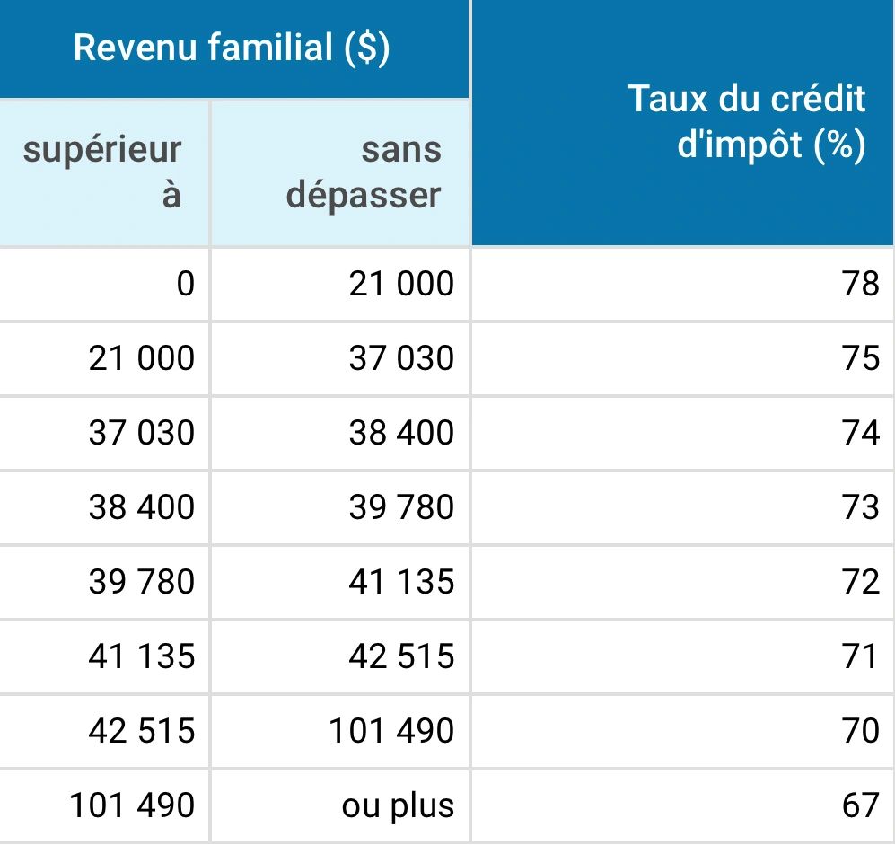Si vous désirez demander le crédit d'impôt pour frais de garde d'enfants, utilisez ce barème pour déterminer le taux du crédit d'impôt correspondant à votre revenu familial pour l'année d'imposition 2021.